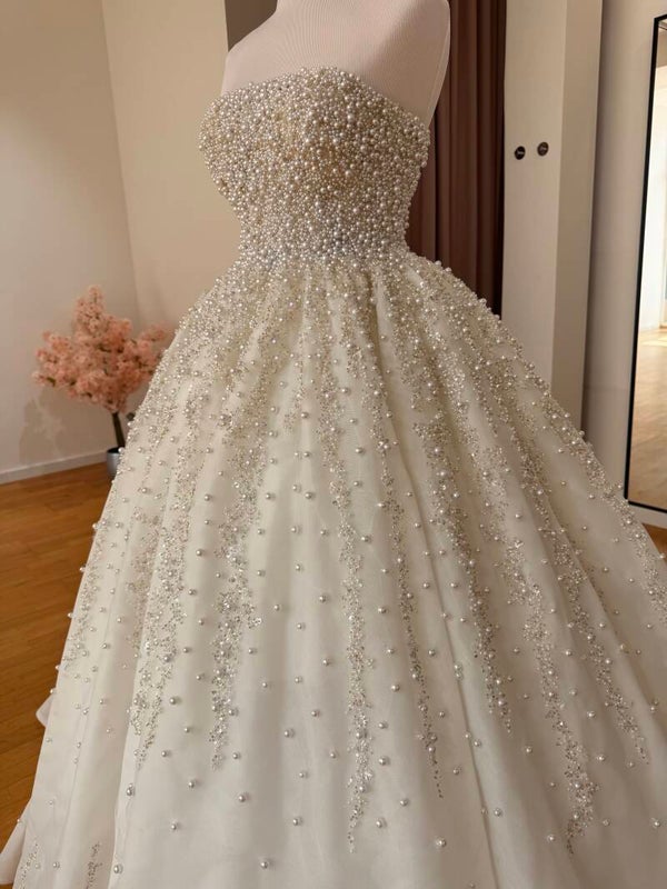 Die aufwendig bestickte Corsage mit Perlenbesatz formt eine traumhafte Silhouette und bietet dank der Schnürung am Rücken optimalen Halt und eine perfekte Passform. Der voluminöse Rock mit eleganter Schleppe rundet den majestätischen Look ab und sorgt für einen großen Auftritt.